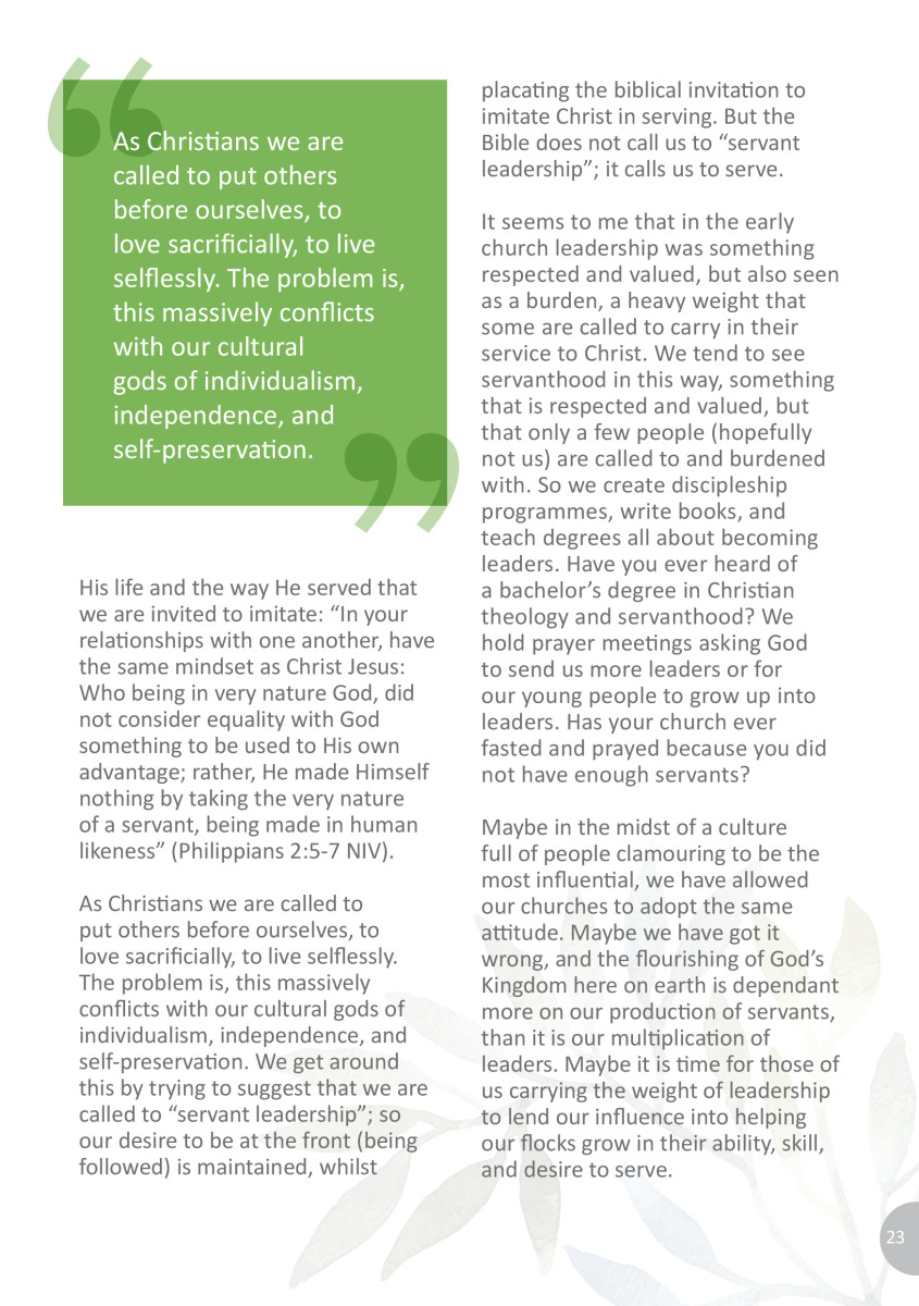 As Christians we are called to put others before ourselves, to love sacrificially, to live selflessly. The problem is, this massively conflicts with our cultural gods of individualism, independence, and self-preservation. We get around this by trying to suggest that we are called to “servant leadership”; so our desire to be at the front (being followed) is maintained, whilst placating the biblical invitation to imitate Christ in serving. But the Bible does not call us to “servant leadership”; it calls us to serve.
