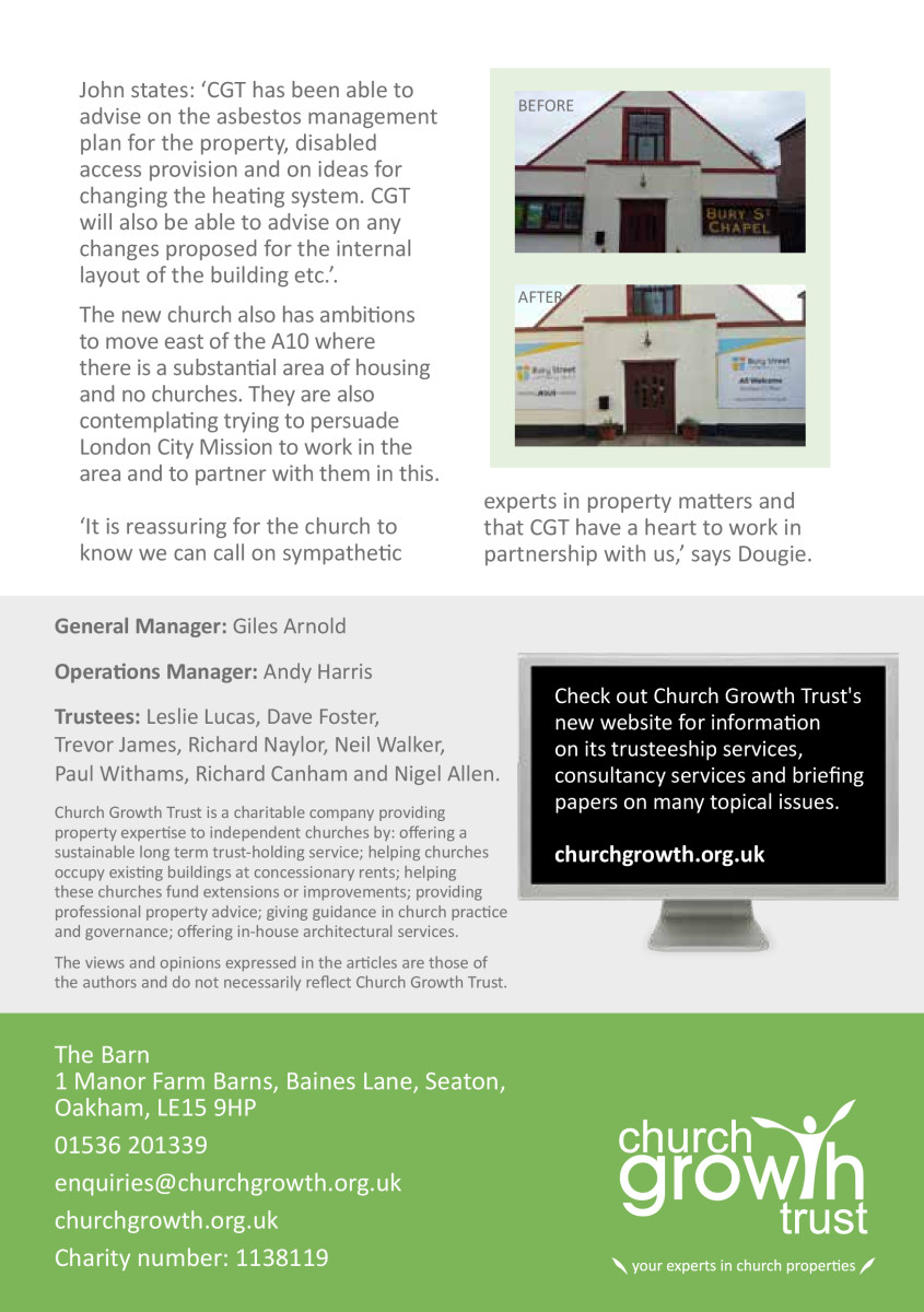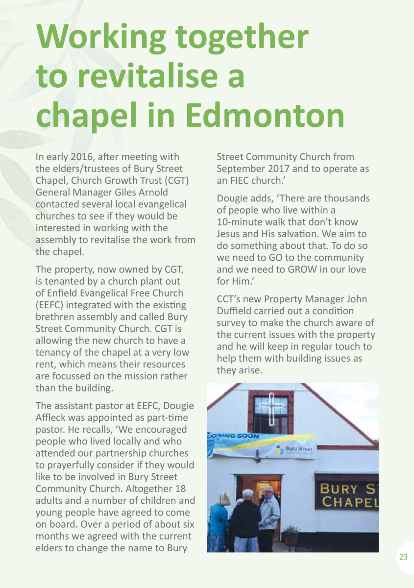 The property, now owned by CGT, is tenanted by a church plant out of Enfield Evangelical Free Church (EEFC) integrated with the existing brethren assembly and called Bury Street Community Church. CGT is allowing the new church to have a tenancy of the chapel at a very low rent, which means their resources are focussed on the mission rather than the building.