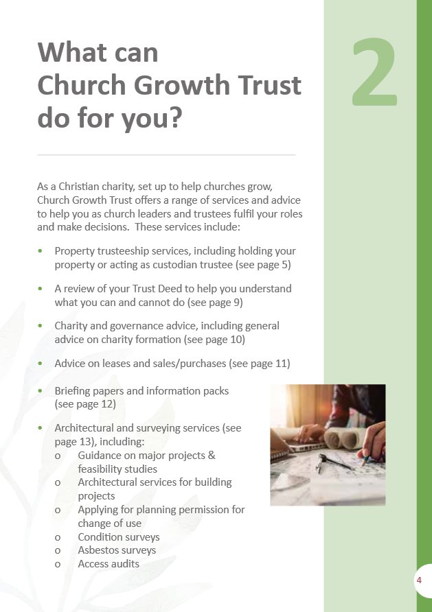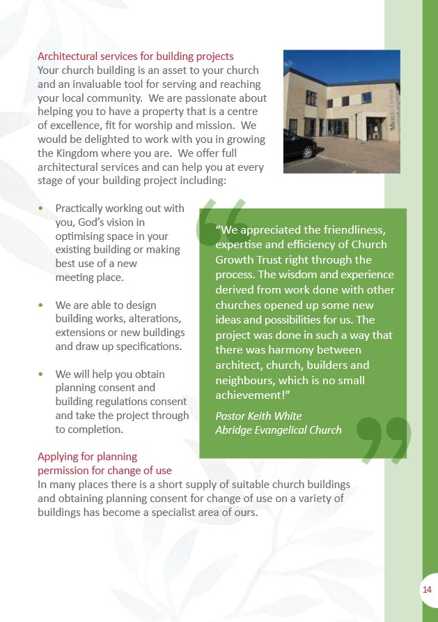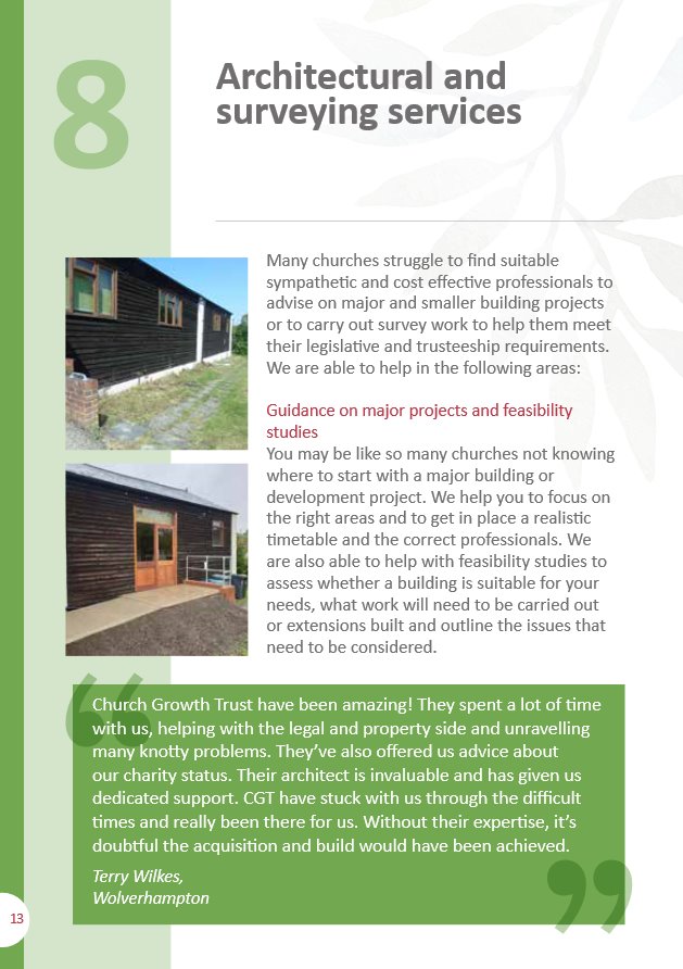 Your Guide To Church Growth Trust’s Services Posted on 9th June 202028th February 2022 by Garryl Willis Related: Your Guide To Church Growth Trust’s Property Trusteeship Services Your Guide to Church Growth Trust’s Architectural Services and the RIBA workstages Increasing demand for Church Growth Trust’s Trusteeship services – April 2019 Church Growth Trust’s vision for making church properties suitability for modern church use – July 2020 Your Guide to Running Church Premises Your A-Z Guide to Church Building Projects Post navigation Coming out of COVID-19 – starting your building projectsCGT vacancy – June 2020